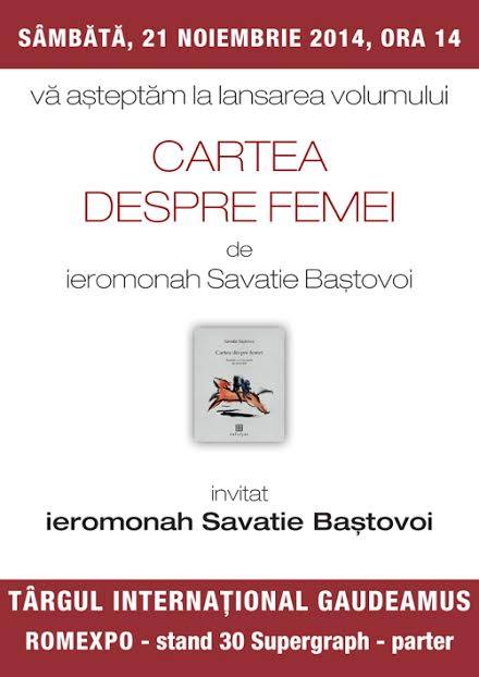 Editura CATHISMA va lansa la Gaudeamus 2015 cartea scrisă de Ieromonahul Savatie Baștovoi intitulată sugestiv Cartea despre femei. Evenimentul va avea loc în prezența autorului, sâmbătă, 21 noiembrie 2015, de la ora 14.00, la Romexpo.