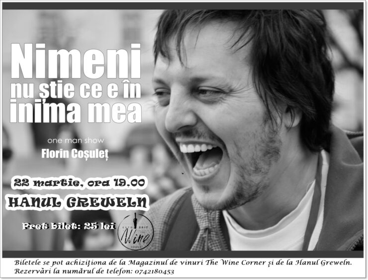 Cel mai îndrăgit actor sibian, Florin Coșuleț va susține ,,Nimeni nu știe ce e în inima mea” – un spectacol cum altul nu-i,în ziua de vineri, 22 martie, la ora 19.00, la Hanul Greweln .