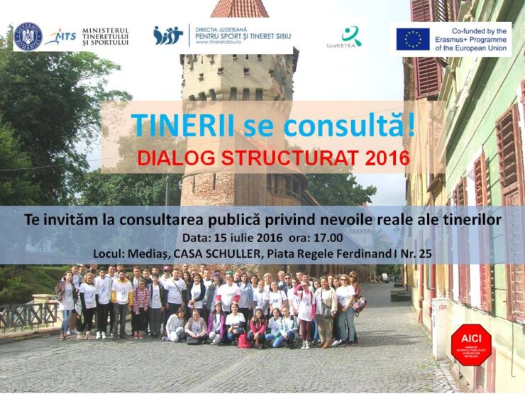 În Medias, primul eveniment din sfera consultării este „Cafeneaua Publică – Tu ești parte din comunitate” va fi organizat în data de 15 iulie, la Casa Schuller, de la ora 17.00, iar la Sibiu, prima întâlnire cu tinerii și reprezentanți ai ONG-urilor va avea loc la data de 20 iulie, de la ora 16.00, la Centrul de Tineret AICI Sibiu, strada Nicolae Teclu nr. 41.