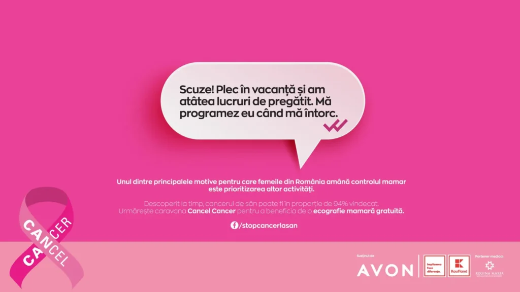 Campania #CancelCancer a fost inițiată de AVON cu sprijinul Kaufland în 2016 și este un demers social cu scopul de a îmbunătăți statisticile, de a educa femeile din România și de a transforma prevenția într-un subiect uzual și firesc.