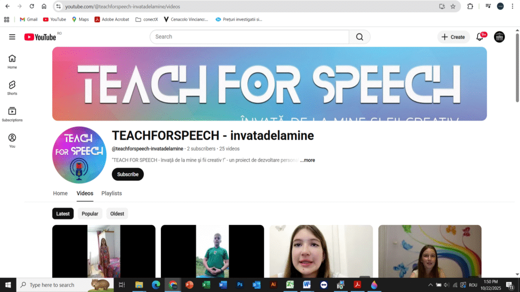 Teach for Speech – învață de la mine și fii creativ este un canal dedicat copiilor și tinerilor care vor să-și descopere vocea, să prindă curaj și să învețe să comunice cu încredere.