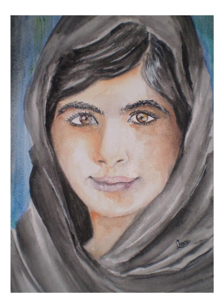 Pentru că mi-am dorit ca Malala să-i motiveze și pe tinerii din Mediaș, am rugat-o pe voluntara Ioana Duma, din Programul ,,Voluntarii cărților în Bibliotecă” să realizeze un portret cu tânăra pakistaneză și să-l amplasăm la Bibliotecă, în Punctul special amenajat pentru voluntari. Ioana Duma are 17 ani și este voluntară la Bibliotecă de un an de zile și a avut organizate până acum expoziții de pictură la Mediaș, Făgăraș, Bazna și la Biblioteca Județeană ,,O. Goga” din Cluj Napoca. Are o colecție de peste 30 de desene, picturi cu teme inspirate din cărți, dar și flori, biserici din Transilvania și portrete.