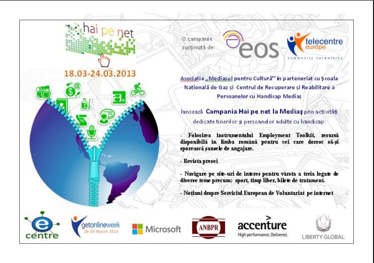 Asociaţia ..Mediaşul pentru Cultură’’ în parteneriat cu Şcoala Naţională de Gaz şi Centrul de Recuperare a Persoanelor cu Handicap din Mediaş desfăşoară în perioada 26 – 30 martie 2013 pentru prima dată ,,Campania Hai pe net’’ într-un centru pentru persoane adulte cu handicap, în care avem deja 2 computere pentru beneficiari.