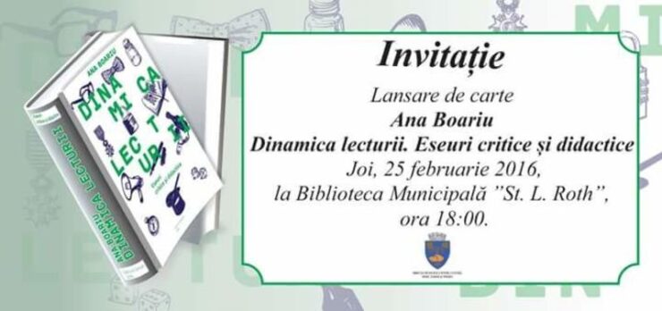 Direcţia Municipală pentru Cultură, Sport, Turism și Tineret Mediaș anunţă apariţia în cadrul colecţiei „Scriitori Medieşeni” a volumului de eseuri critice şi didactice intitulat ,,Dinamica lecturii”, semnat de doamna prof. Ana Boariu.