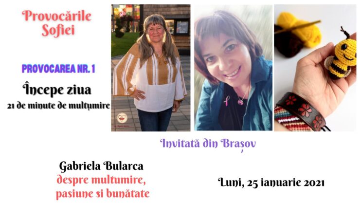 Gabriela Bularca a răspuns provocării de a mulțumi timp de 21 de minute unor persoane dragi, pentru lucrurile frumoase din viața ei, pentru speranță, pentru bucurie, dar mai ales a dorit să mulțumească ,,tuturor persoanelor care zâmbesc pe stradă. Le zâmbesc ochii, chiar dacă poartă mască.”