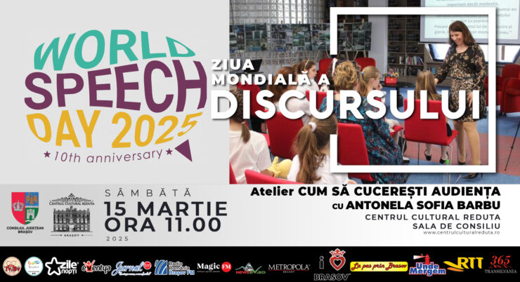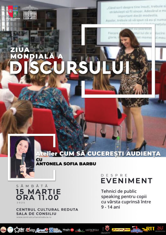 Centrul Cultural Reduta va marca în acest an ZIUA MONDIALĂ A DISCURSULUI, în data de 15 martie 2025, de la ora 11.00 printr-un atelier în care copiii cu vârsta cuprinsă între 9 – 14 ani vor deprinde câteva tehnici de public speaking.