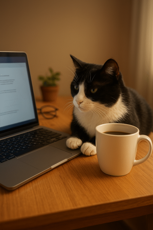 Mă uit la motanul meu care toarce aproape de laptop. E un contrast perfect: el simte, eu scriu, AI calculează.