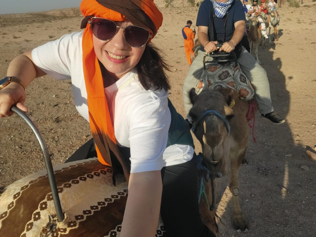Mergeam călare pe o cămilă și, într-o încercare aproape comică, încercam să-l surprind pe soțul meu și zâmbetul cămilei.
