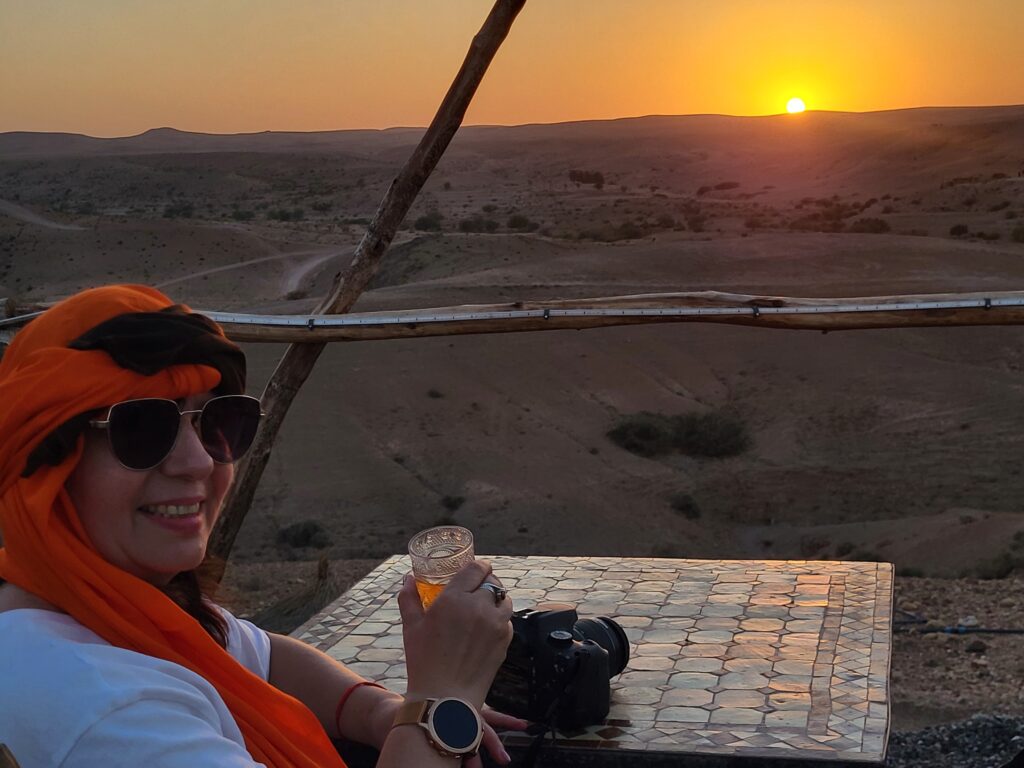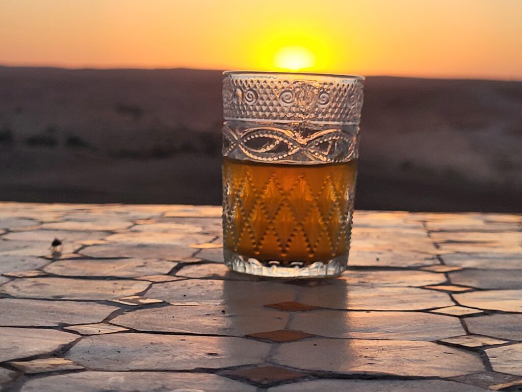 Într-o clipă de lumină perfectă, în deșertul Agafay am scos telefonul să surprind reflexia soarelui într-un pahar de ceai.