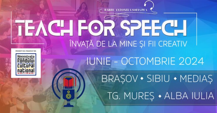 Proiectul „TEACH FOR SPEECH – învață de la mine și fii creativ !” vizează utilizarea culturii și a creativității în cadrul non-formal pentru copii cu vârsta cuprinsă între 9 și 15 ani, este implementat de Barbu Antonela Sofia PFA și co-finanțat de Administrația Fondului Cultural Național, în sesiunea II/2024, cu un buget total de 102.793 lei, din care 92.220 lei reprezintă finanțarea nerambursabilă.